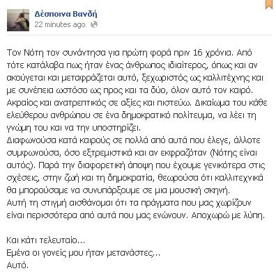 Την αποχώρησή της από το κοινό σχήμα με το Νότη Σφακιανάκη ανακοίνωσε η Δέσποινα Βανδή, μέσω ανάρτησή της στο Facebook, μετά τις δηλώσεις του τραγουδιστή υπέρ της Χρυσής Αυγής.