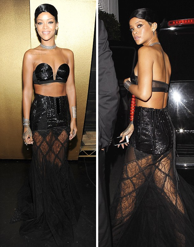 Με ένα κορμί που ανάβει φωτιές και ένα χαμόγελο που δεν μπορούσε να κρύψει, η RiRi ντυμένη με μια μαύρη δημιουργία με την υπογραφή Jean Paul Gaultier Haute Couture Spring 2013 και σανδάλια Chaos του στιλίστα Manolo Blahnik, είδε τα βλέμματα και τα φλας να αστράφτουν επάνω της.