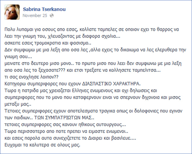 Κατηγορω συμπεριφορες που εχουν ΔΙΑΣΠΑΣΤΙΚΟ ΧΑΡΑΚΤΗΡΑ. Τωρα η πατριδα μας χρειαζεται Ελληνες ενωμενους και οχι δηλωσεις και συμπεριφορες που το μονο που καταφερνουν ειναι να σπερνουν διχονοια και μισος μεταξυ μας.. Τετοιες συμπεριφορες εχουν αποτελεσματα τραγικα οπως οι δολοφονιες που εγιναν των παιδιων.. ΤΩΝ ΣΥΜΠΑΤΡΙΩΤΩΝ ΜΑΣ.. τετοιες συμπεριφορες σας κανουν ηθικους αυτουργους… Τωρα περισσοτερο απο ποτε πρεπει να ειμαστε ενωμενοι.. και εσεις παρολα αυτα συνεχιζετετε το Διαιρει και βασιλευε…. Ευχομαι τα καλυτερα σε ολους μας.»