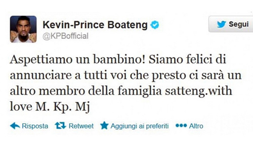 Όπως αναφέρεται στο tweet, «Περιμένουμε ένα μωράκι! Είμαστε στην ευχάριστη θέση να σας ανακοινώσουμε πως πολύ σύντομα θα υπάρχει ένα νέο μέλος στην οικογένεια satteng. Με αγάπη, Melissa, Kevin Prince Boateng».