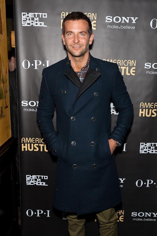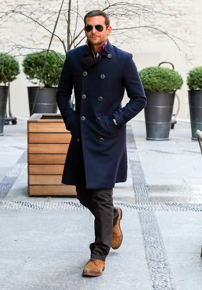 Ο Bradley Cooper φόρεσε ένα ναυτικό Tommy Hilfiger μαύρο σταυρωτό peacoat παλτό, με εγκοπή στο πέτο και μαύρη λωρίδα στο μανίκι. Παρόμοια στύλ είναι διαθέσιμα σήμερα σε Tommy Hilfiger Flagship καταστήματα.