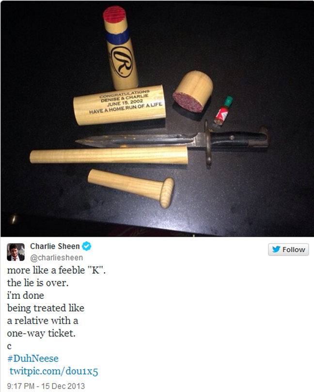 Μοιραία λοιπόν ο Τσάρλι «τρελάθηκε» και ξέσπασε στο Twitter, ποστάροντας ένα πετσοκομμένο μπαστούνι του μπέιζμπολ (ενθύμιο από τον γάμο τους) και ένα μαχαίρι γράφοντας: «Το ψέμα τελείωσε. Βαρέθηκα να μου συμπεριφέρονται σαν συγγενή με εισιτήριο χωρίς επιστροφή».