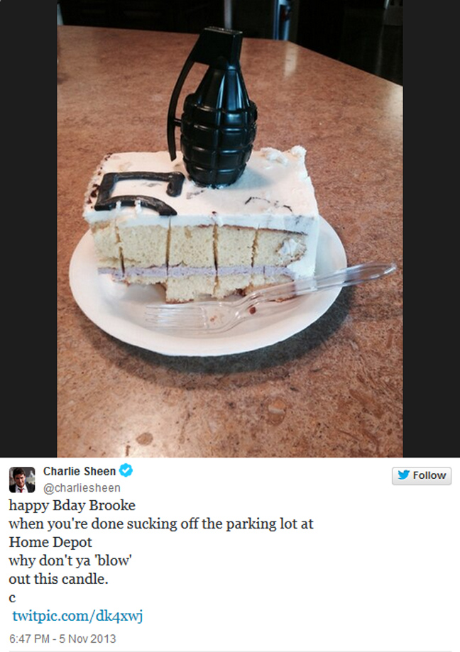 Και βέβαια έναν μήνα πρωτύτερα ο Σιν ξέσπασε και κατά της άλλης πρώην του, Brooke Mueller, αφιερώνοντάς της για τα γενέθλιά της ένα κομμάτι τούρτα με μια χειροβομβίδα στην κορφή! Τι κι αν τα γενέθλια της πρώην είναι στις… 19 Αυγούστου, τα περιοριστικά μέτρα που ζήτησε εκείνη κατά του Σιν τον έβγαλαν από τα ρούχα του τον άνθρωπο.