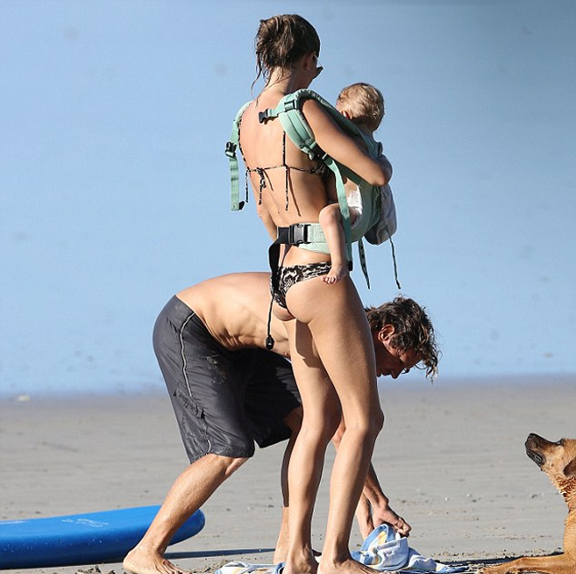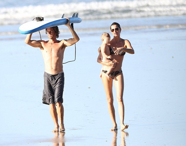 Η Gisele που βρίσκεται σε τέλεια φόρμα έδειξε το σμιλεμένο της κορμί στους φωτογράφους που δεν έχαναν βήμα της και δεν έχασε την ευκαιρία να μάθει σερφ στην μικρούλα Vivian…