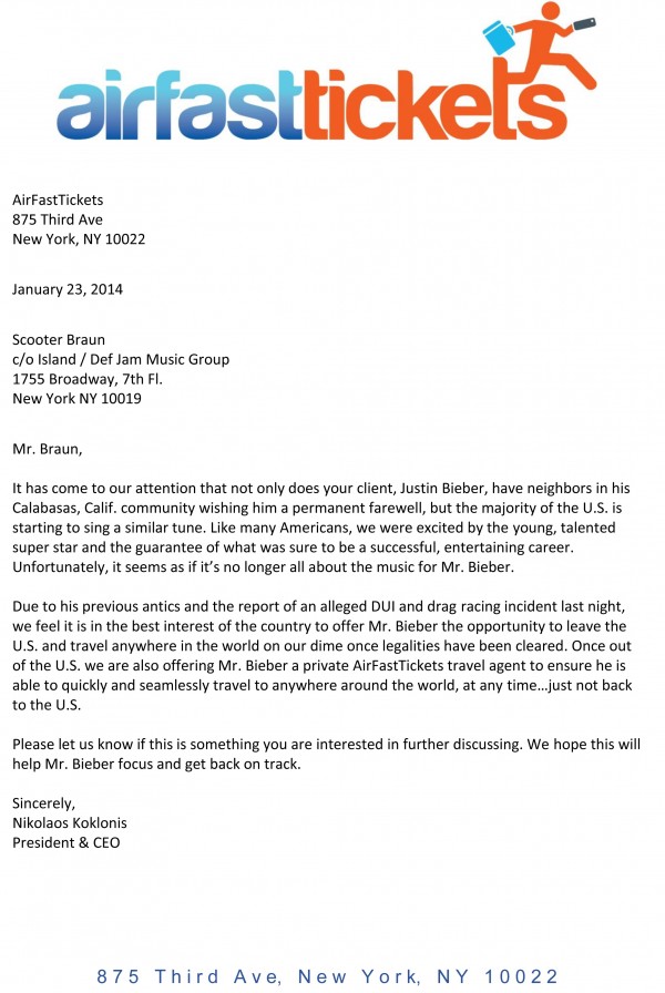 Στην επιστολή που έστειλε στον ποπ σταρ, ο ιδρυτής και πρόεδρος της εταιρείας κ. Νίκος Κοκλώνης, σημειώνει ότι η AirFastTickets.com θα πληρώνει όλα τα αεροπορικά του εισιτήρια για οπουδήποτε… αρκεί να μείνει εκτός Αμερικής! Επιπλέον, παρέχει στον ποπ σταρ ένα ταξιδιωτικό πράκτορα που θα τον βοηθήσει να ταξιδεύει άμεσα και απρόσκοπτα όπου επιθυμεί.