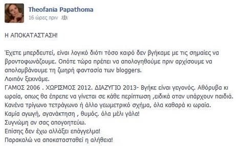 Μέσω Facebook επέλεξε να απαντήσει η Θεοφανία Παπαθωμά σε όσα ειπώθηκαν και γράφτηκαν τις τελευταίες ημέρες για το διαζύγιό της με τον Πασχάλη Τσαρούχα αλλά και τη σχέση της με τον Γρηγόρη Πετράκο.
