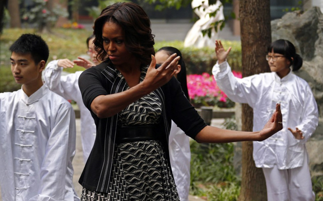 Η Μισέλ Ομπάμα αφού μίλησε για την εθνική ισότητα, τα πολιτικά δικαιώματα και την θρησκευτική ελευθερία σε σχολείο στην επαρχία Σιτσουάν της Κίνας, μυήθηκε από τους μαθητές στο Τάι Τσι…
