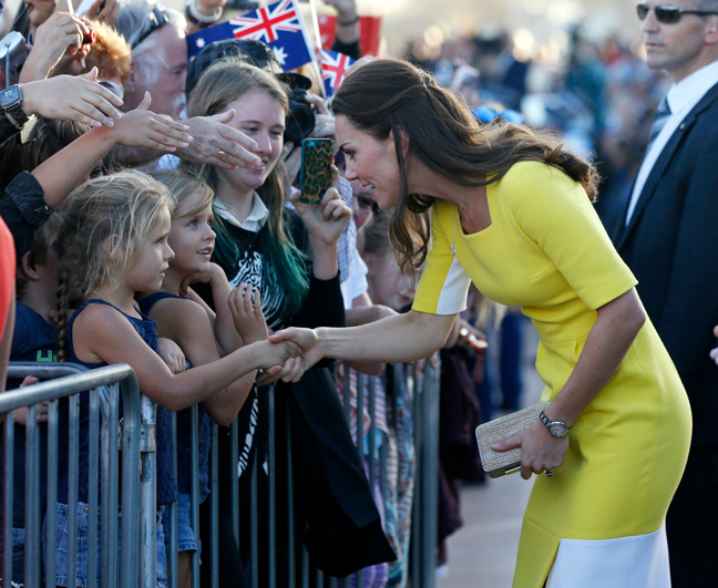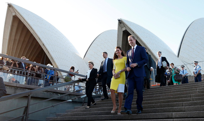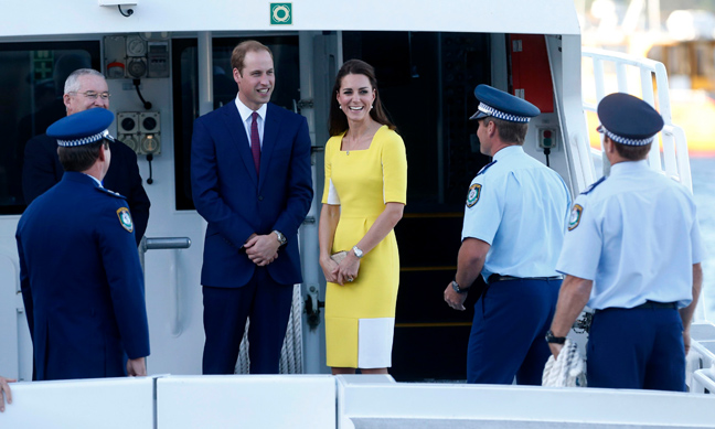 Στον δεύτερο και τελευταίο σταθμό της περιοδείας τους στα βρετανικά υπερπόντια εδάφη, το Σίδνεϊ της Αυστραλίας, έφτασαν σήμερα ο πρίγκιπας Γουίλιαμ και η Κέιτ Μίντλετον με τον οκτώ μηνών γιο τους πρίγκιπα Γεώργιο. Η δούκισσα του Κέιμπριτζ εντυπωσίασε το κοινό που είχε συγκεντρωθεί στο αεροδρόμιο για την υποδοχή τους φορώντας ένα κίτρινο φόρεμα, ο σύζυγός της πάντως δεν φαίνεται να επιδοκιμάζει την επιλογή της.