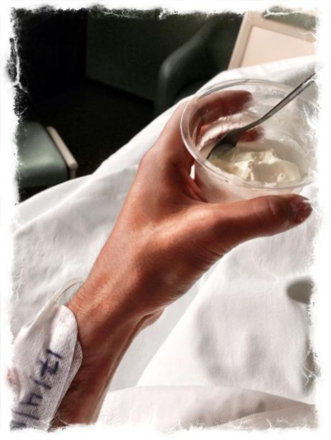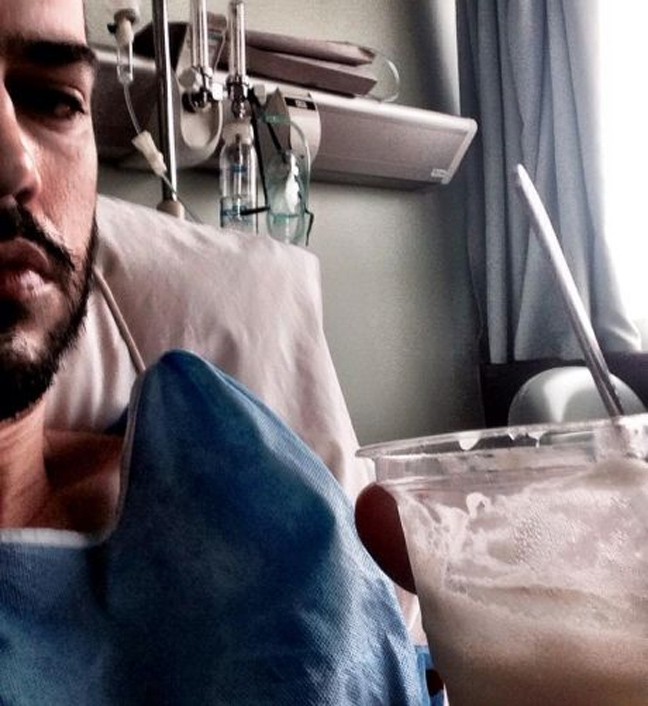 Ο γνωστός Έλληνας ηθοποιός ανέβασε στο λογαριασμό του στο Facebook φωτογραφίες από από το νοσοκομείο και τις συνόδευσε με το σχόλιο: «Περάσαμε μαζί 33 χρόνια με τις χαρές μας, με τις λύπες μας, δεν σου αντιμίλησα ποτέ, σε άφησα να ξεσπάς εσύ και η αδερφή σου στο κορμί μου όποτε θέλατε και ‘γω έτρεμα σαν το ψάρι! Όλο το αλκοόλ και το τσιγάρο μαζί το μοιραστήκαμε και περνούσαμε καλά τη ζωή μας όμως όλα τα ωραία κάποτε τελειώνουν! Καλό ταξίδι να έχεις αμυγδαλή μου, φιλιά στην αδερφή σου».