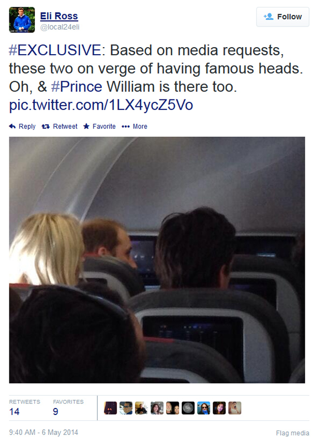 Οι επιβάτες της πτήσης έμειναν έκπληκτοι όταν είδαν τον William να μπαίνει στο αεροπλάνο μαζί με τη φρουρά του και να πηγαίνει και να κάθεται ανάμεσα τους, στην οικονομική θέση. Το γεγονός κατέγραψε… φωτογραφικά δημοσιογράφος της US television και ανέβασε τη φωτογραφία στο twitter. Αναφερόμενος στο γεγονός, αλλά και στο ότι στο διάρκειας 1,5 ώρας ταξίδι ο πρίγκιπας ζήτησε μόνο μεταλλικό νερό, ο δημοσιογράφος έγραψε: «Είμαι ακόμα εντυπωσιασμένος… ο πρίγκιπας William… πόσο ταπεινός…».
