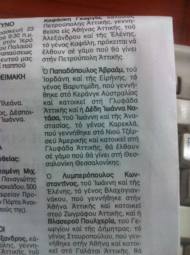 Στην εφημερίδα «Εστία» δημοσιεύτηκε σήμερα η αναγγελία γάμου του Αβραάμ Παπαδόπουλου με την εκλεκτή της καρδιάς του, Ιωάννα Δέδη.