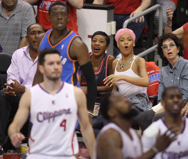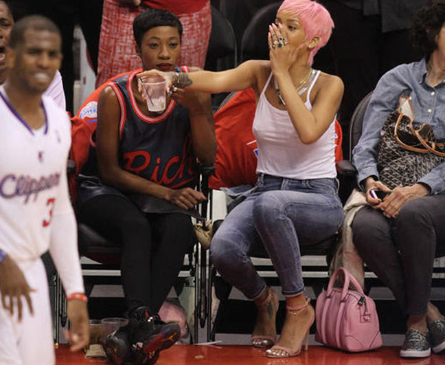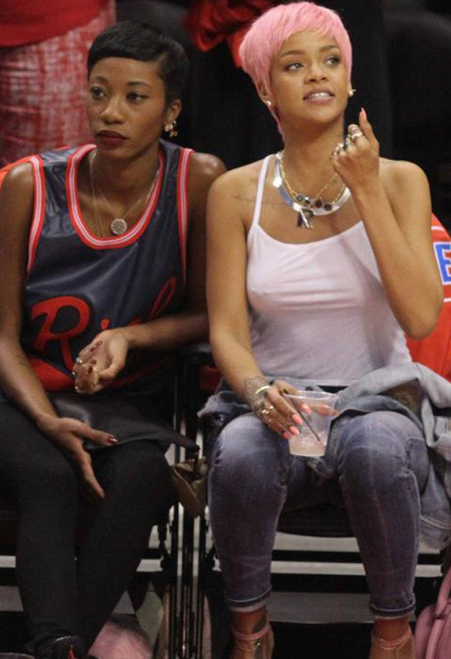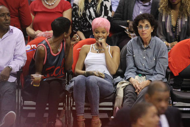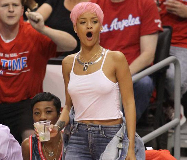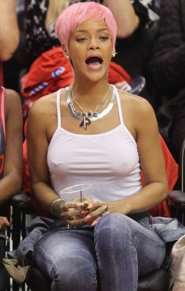 Η εντυπωσιακή Rihanna, με τα αισθησιακά μάτια και το αψεγάδιαστο κορμί, παρέστη σε έναν αγώνα μπάσκετ στο Λος Άντζελες, με ένα λευκό μπλουζάκι το οποίο δεν μπορούσε να καλύψει το… πίρσινγκ που έχει στο στήθος, ενώ την εμφάνισή της συμπλήρωνε ένα τσαντάκι και πέδιλα στο ίδιο χρώμα των μαλλιών της.
