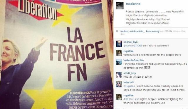 Η διάσημη τραγουδίστρια της ποπ μουσικής Μαντόνα εξέφρασε την ανησυχία της στον προσωπικό της λογαριασμό στον ιστότοπο κοινωνικής δικτύωσης Instagram για τα ποσοστά που συγκέντρωσε το Εθνικό Μέτωπο (FN) της Γαλλίας στις ευρωεκλογές, προκαλώντας τη σαρκαστική αντίδραση του αντιπροέδρου του κόμματος αυτού της Ακροδεξιάς.