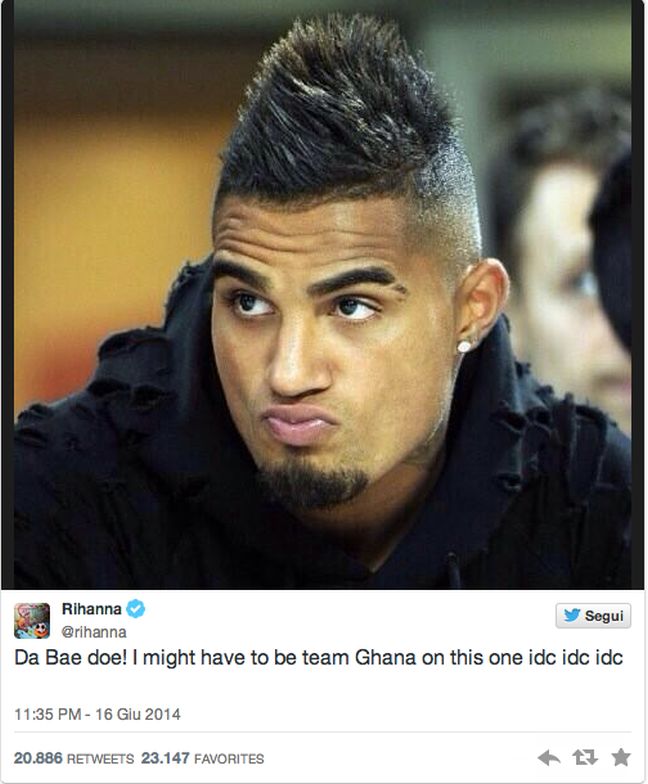 Η Ιταλίδα παρουσιάστρια και σόου γούμαν Melissa Satta δεν άφησε αναπάντητο το tweet της Rihanna που έγραψε πως στο μουντιάλ υποστηρίζει την Γκάνα, επειδή «παίζει στην ομάδα ο όμορφος Kevin Prince Boateng».