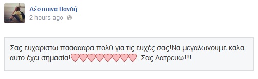 «Σας ευχαριστώ πάρα πολύ για τις ευχές σας! Να μεγαλώνουμε καλά, αυτό έχει σημασία. Σας λατρεύω», έγραψε σε Twitter και Facebook η τραγουδίστρια.