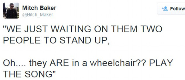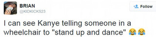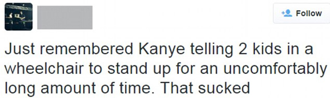 Μόλις ο σωματοφύλακας του τού το επιβεβαίωσε –ότι όντως ο άνθρωπος καθόταν σε αναπηρικό αμαξίδιο- ο Κάνιε το πήρε απόφαση και ξανάρχισε να τραγουδάει. Ο κόσμος τον αποδοκίμασε τόσο κατά τη διάρκεια της συναυλίας, όσο και μετά στα social media, καθώς ο Γουέστ δε λέει να βάλει μυαλό!