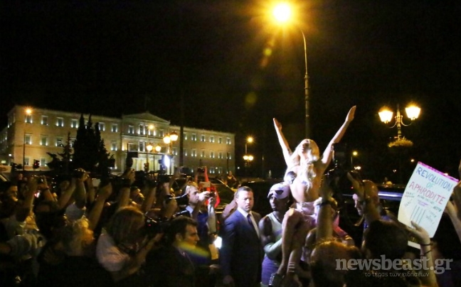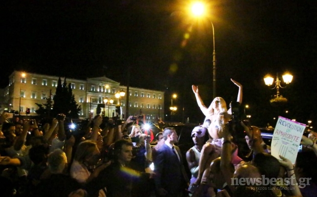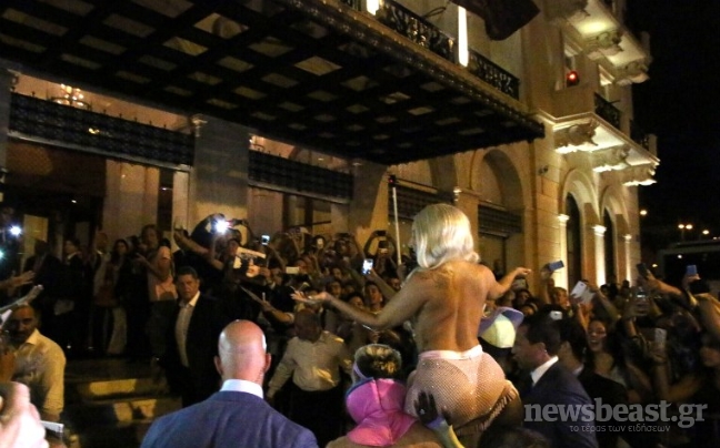 Φορώντας χρυσά κοχύλια στο στήθος και μία διχτυωτή διάφανη φούστα, έδωσε σόου στο αεροδρόμιο πριν μπει στο αυτοκίνητο που θα τη μετέφερε στο ξενοδοχείο της.