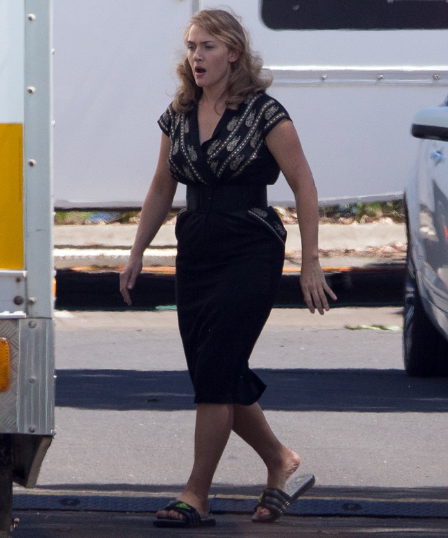 Ο φωτογραφικός φακός την απαθανάτισε στα γυρίσματα του φιλμ «Τhe Dressmaker» με παραπανίσια κιλά, έχοντας συνδυάσει ένα βραδινό φόρεμα με… πλαστικές παντόφλες.