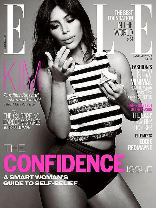 Έχοντας καλυμμένα όλα τα επίμαχα σημεία του κορμιού της η Kim, δείχνει να απολαμβάνει το cup cake της συμβουλεύοντας παράλληλα τις γυναίκες να έχουν εμπιστοσύνη στον εαυτό τους.