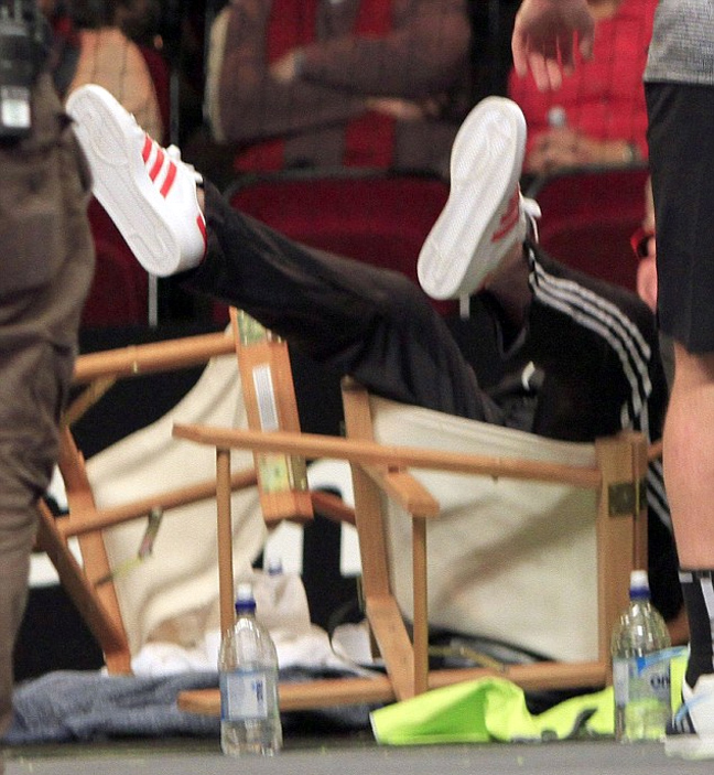 Δεν ήταν και πολύ ήσυχος όμως. Κάποια στιγμή θέλησε να πανηγυρίσει, αλλά αντί γι’ αυτό κατάφερε να «φάει» μία από τις πλέον επικές τούμπες. Η καρέκλα του αναποδογύρισε και θύμισε κάτι από σκηνή εκπομπών που δείχνουν αστεία βίντεο.