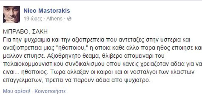«ΜΠΡΑΒΟ, ΣΑΚΗ! Για την ψυχραιμία και την αξιοπρέπεια που αντέταξες στην υστερία και αναξιοπρέπεια μιας “ηθοποιού”, η οποία κάθε άλλο παρά ήθος εποίησε και μάλλον επύησε. Αξιοθρήνητο θέαμα, θλιβερό απομεινάρι του παλαιοκομμουνιστικού συνδικαλισμού, όπου κανείς χρεαζόταν άδεια για να είναι… ηθοποιός. Τώρα, άλλαξαν οι καιροί και οι νοσταλγοί των κλειστών επαγγελμάτων, πρέπει να πάρουν άδεια από ψυχίατρο», έγραψε ο Νίκος Μαστοράκη στο Facebook.