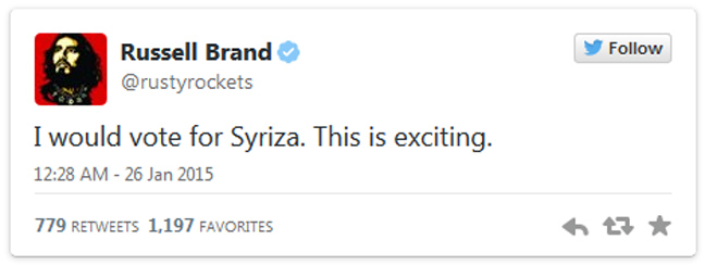 Μέσα από τον προσωπικό του λογαριασμό στο twitter, ο ηθοποιός και πρώην σύζυγος της Katy Perry, εξέφρασε ανοιχτά την πολιτική του τοποθέτηση, υπέρ του ΣΥΡΙΖΑ: