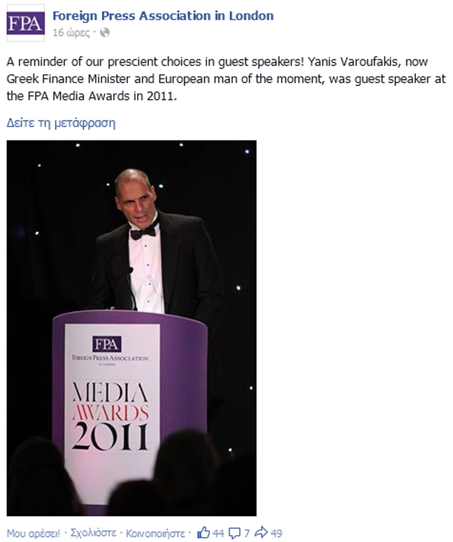 Η ανάρτηση συνοδεύτηκε μάλιστα από την εξής λεζάντα: «Μια υπενθύμιση για τις προφητικές μας επιλογές για τους προσκεκλημένους ομιλητές μας. Ο Έλληνας υπ. Οικονομικών και για την ώρα άντρας της Ευρώπης ήταν προσκεκλημένος ομιλητής στα FPA Media Awards το 2011».