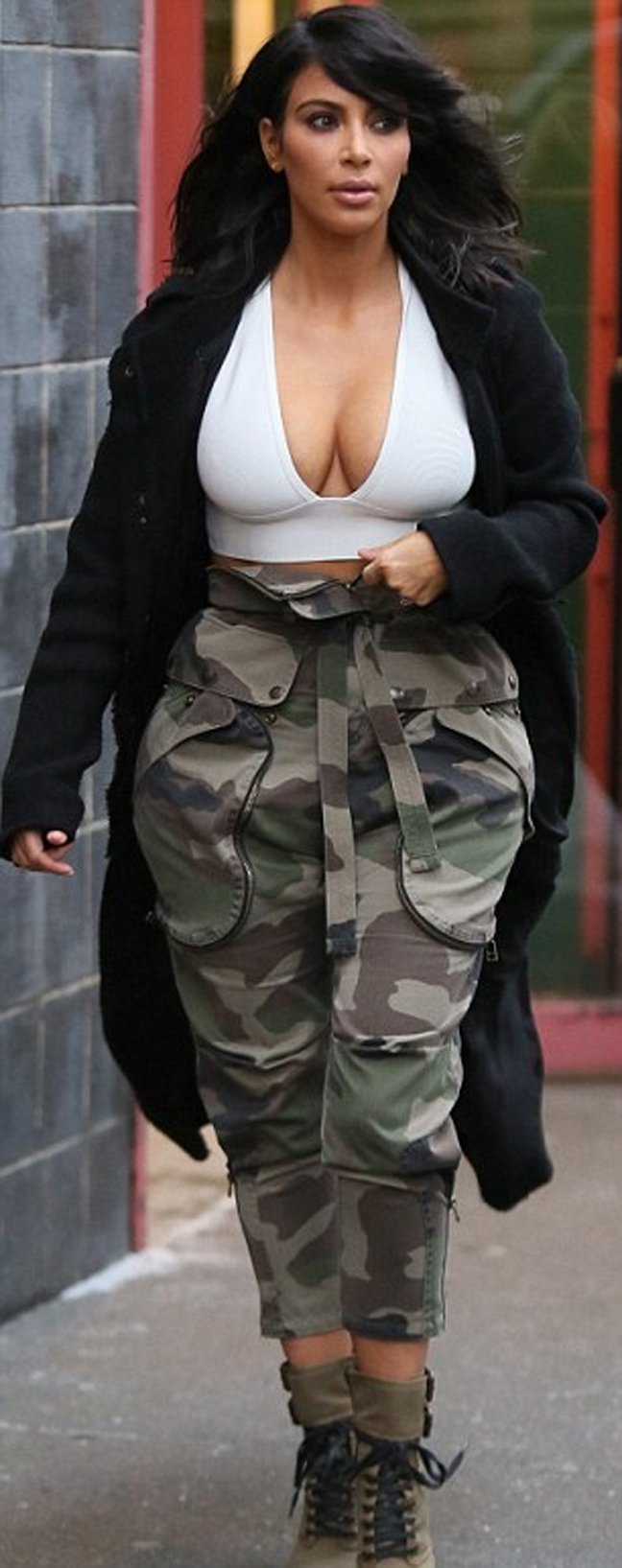 Τι και αν ο θερμόμετρο έδειχνε αρκετούς βαθμούς κάτω από το μηδέν. Η Kim εθεάθη στους δρόμους της πόλης φορώντας ένα στρατιωτικό παντελόνι και από πάνω ένα λευκό τοπ που άφηνε το πληθωρικό της μπούστο και την κοιλιά της εκτεθειμένα στο κρύο.