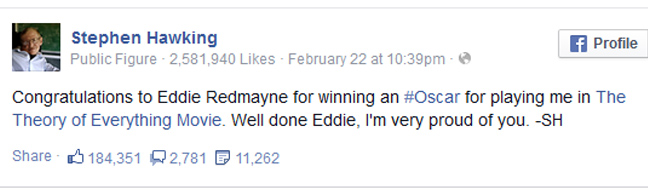 «Συγχαρητήρια στον Έντι Ρεντμέιν που κέρδισε το Όσκαρ παίζοντας εμένα στη “Θεωρία των πάντων”. Μπράβο Εντι, πολύ καλή δουλειά. Είμαι πολύ περήφανος για σένα», διεμήνυσε στον βρετανό ηθοποιό μέσω Facebook.