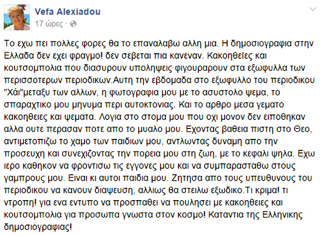 «Το έχω πει πολλές φορές θα το επαναλάβω άλλη μια. Η δημοσιογραφία στην Ελλάδα δεν έχει φραγμό! Δεν σέβεται πια κανέναν. Κακοήθειες και κουτσομπολιά που διασύρουν υπολήψεις φιγουράρουν στα εξώφυλλα των περισσότερων περιοδικών. Αυτή την εβδομάδα στο εξώφυλλο του περιοδικού “Χάι” μεταξύ των άλλων, η φωτογραφία μου με το ασύστολο ψέμα, το σπαρακτικό μου μήνυμα περί αυτοκτονίας. Και το άρθρο μέσα γεμάτο κακοήθειες και ψέματα. Λόγια στο στόμα μου που όχι μόνον δεν ειπώθηκαν αλλά ούτε πέρασαν ποτέ από το μυαλό μου. Έχοντας βαθιά πίστη στο Θεό, αντιμετωπίζω το χαμό των παιδιών μου, αντλώντας δύναμη από την προσευχή και συνεχίζοντας την πορεία μου στη ζωή, με το κεφάλι ψηλά. Έχω ιερό καθήκον να φροντίσω τις εγγονές μου και να συμπαρασταθώ στους γαμπρούς μου. Είναι κι αυτοί παιδιά μου. Ζήτησα από τους υπευθύνους του περιοδικού να κάνουν διάψευση, αλλιώς θα στείλω εξώδικο. Κρίμα! Τι ντροπή για ένα έντυπο να προσπαθεί να πουλήσει με κακοήθειες και κουτσομπολιά για πρόσωπα γνωστά στον κόσμο! Κατάντια της ελληνικής δημοσιογραφίας!» γράφει στο Facebook.