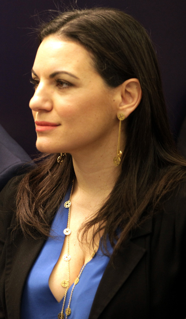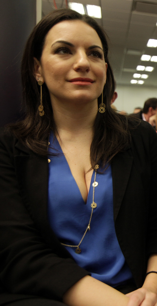 Η πρώην υπουργός κατάφερε να μονοπωλήσει το ενδιαφέρον των φωτογράφων με το βαθύ σκίσιμο στο μπλε της σατέν μπλουζάκι που άφηνε σε κοινή θέα το πληθωρικό της ντεκολτέ.