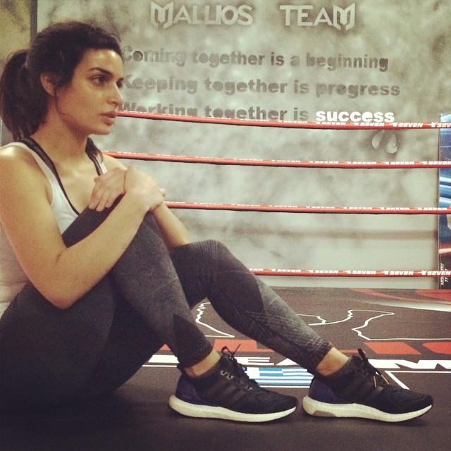 Φορώντας αθλητικά, κολάν και με τα μαλλιά πιασμένα πάνω, κάθεται στο πάτωμα να πάρει μία ανάσα.