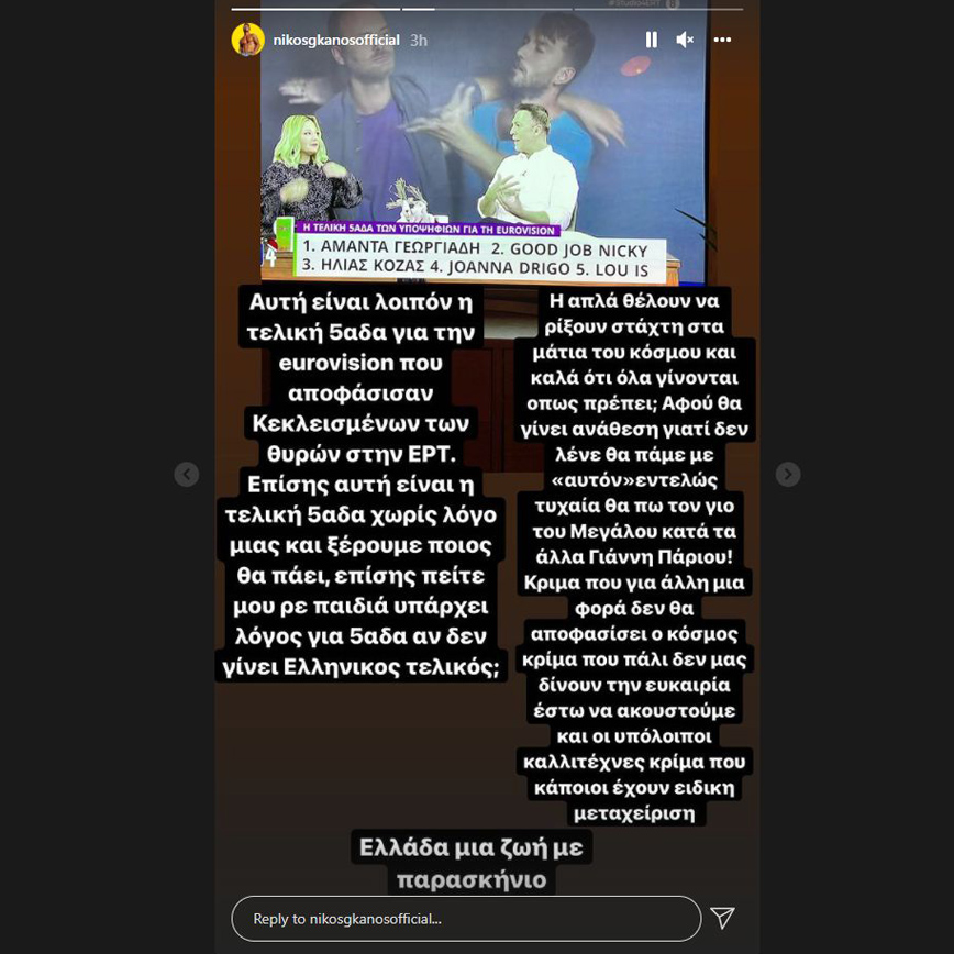 Συγκεκριμένα, «ανέβασε» δυο instastories στα οποία στράφηκε κατά της μεθόδου που ακολουθεί η ΕΡΤ ώστε να αναδειχθεί ο καλλιτέχνης που θα εκπροσωπήσει την Ελλάδα στην Eurovision.