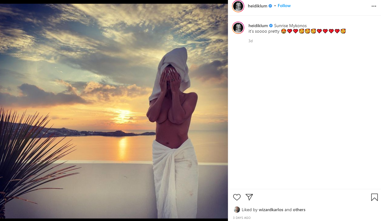 «Ανατολή στη Μύκονο, είναι τόσο όμορφα» έγραψε η Χάιντι Κλουμ κάτω από τη φωτογραφία της στο Instagram όπου φαίνεται τυλιγμένη με μια πετσέτα να απολαμβάνει το θέαμα.