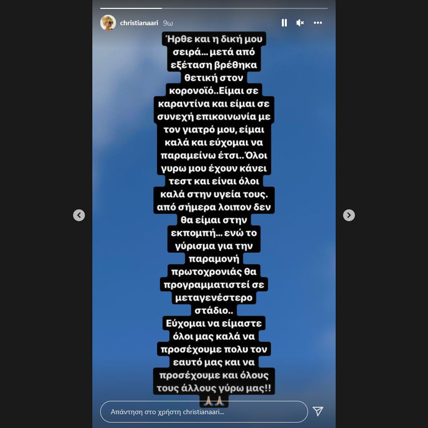 «Ήρθε και η δική μου σειρά. Μετά από εξέταση, βρέθηκα θετική στον κορονοϊό. Είμαι σε καραντίνα και είμαι σε συνεχή επικοινωνία με τον γιατρό μου. Είμαι καλά και εύχομαι να παραμείνω έτσι. Όλοι γύρω μου έχουν κάνει τεστ και είναι καλά στην υγεία τους. Από σήμερα, λοιπόν, δεν θα είμαι στην εκπομπή. Ενώ το γύρισμα για την παραμονή πρωτοχρονιάς θα προγραμματιστεί σε μεταγενέστερο στάδιο. Εύχομαι να είμαστε όλοι καλά, να προσέχουμε πολύ τον εαυτό μας και να προσέχουμε και όλους τους άλλους γύρω μας» έγραψε η Χριστιάνα Αριστοτέλους στο κείμενο που δημοσίευσε στον προσωπικό της λογαριασμό στο Instagram.