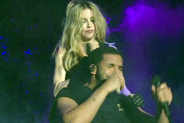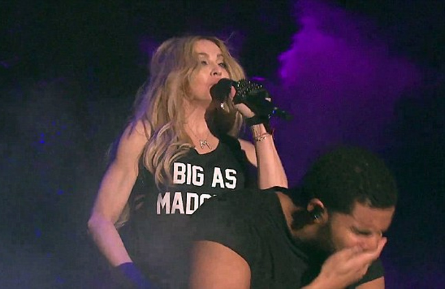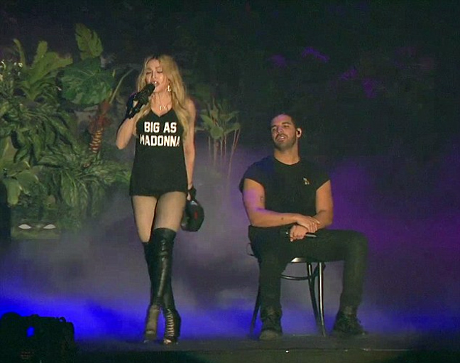 Η βασίλισσα της ποπ, φορώντας ένα μπλουζάκι με τη φράση «Big as Madonna», ερμήνευε το «Human Nature» και στη σκηνή βρισκόταν και ο 28χρονος Ντρέικ ο οποίος ήταν καθισμένος σε μια καρέκλα. Η Μαντόνα τον πλησιάζει, σκύβει και τον φιλάει στο στόμα παθιασμένα. Εκείνος σηκώνει το χέρι του για να της χαϊδέψει τα μαλλιά, και η 56χρονη σταρ του απωθεί το χέρι.