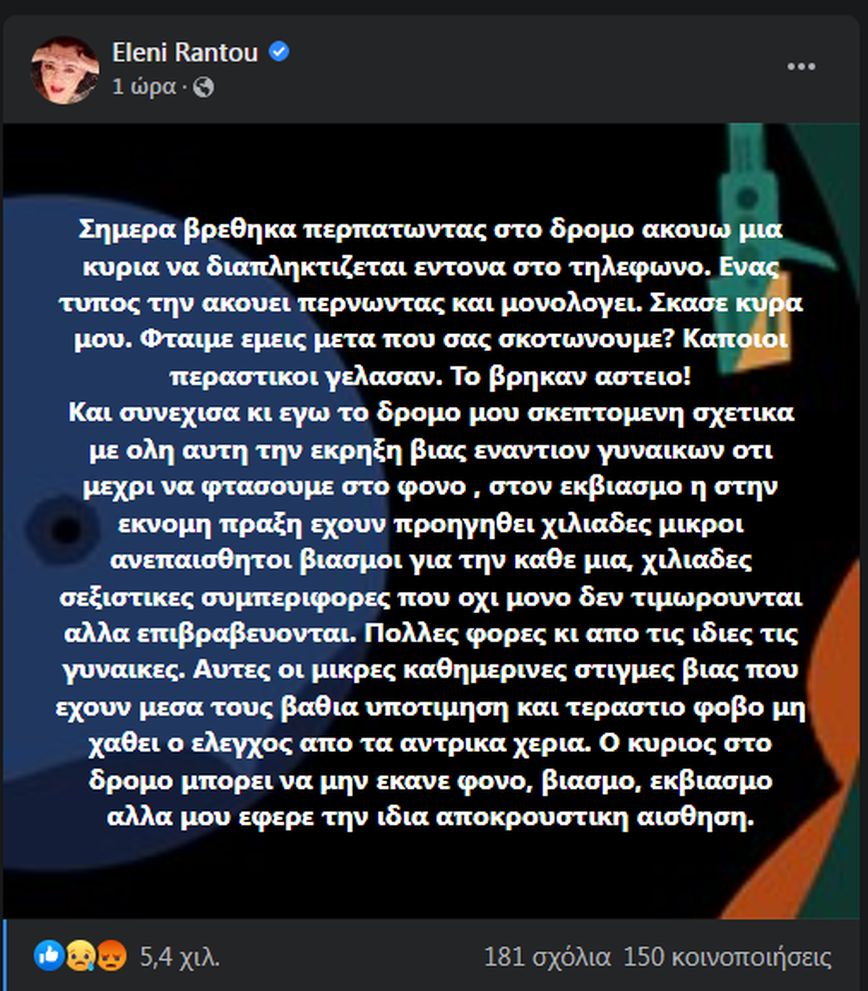 Και συνέχισα κι εγώ το δρόμο μου σκεπτόμενη σχετικά με όλη αυτή την έκρηξη Βίας εναντίον γυναικών ότι μέχρι να φτάσουμε στο φόνο , στον εκβιασμό η στην έκνομη πράξη έχουν προηγηθεί χιλιάδες μικροί ανεπαίσθητοι βιασμοί για την κάθε μια, χιλιάδες σεξιστικές συμπεριφορές που όχι μόνο δεν τιμωρούνται αλλά επιβραβεύονται. Πολλές φορές κι από τις ίδιες τις γυναίκες. Αυτές οι μικρές καθημερινές στιγμές Βίας που έχουν μέσα τους βαθιά υποτίμηση και τεράστιο φόβο μη χαθεί ο έλεγχος από τα αντρικά χέρια. Ο κύριος στο δρόμο μπορεί να μην έκανε φόνο, βιασμό, εκβιασμό αλλά μου έφερε την ίδια αποκρουστική αίσθηση» έγραψε η Ελένη Ράντου.