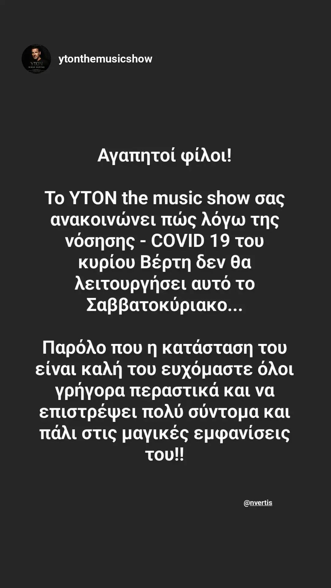 «Αγαπητοί φίλοι, το YTON the music show σας ανακοινώνει πως λόγω της νόσησης COVID-19 του κυρίου Βέρτη δε θα λειτουργήσει αυτό το Σαββατοκύριακο. Παρόλο που η κατάσταση του είναι καλή, του ευχόμαστε όλοι γρήγορα περαστικά και να επιστρέψει πολύ σύντομα και πάλι στις μαγικές εμφανίσεις τους», αναφέρει η σχετική ανάρτηση του μαγαζιού στο Instagram, που κοινοποίησε κι ο τραγουδιστής.