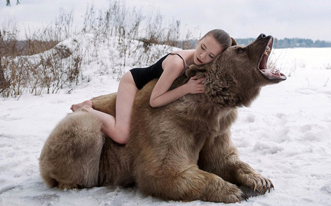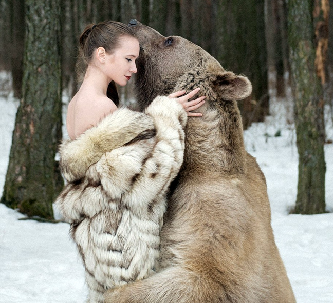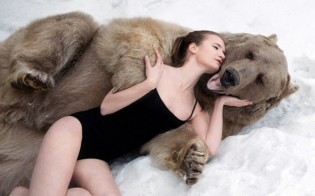 Τα γενναία μοντέλα, Maria Sidorova και Lidia Fetisova, φιλούν, και αγκαλιάζουν μια αληθινή γιγαντόσωμη αρκούδα, ονόματι Stephen, χωρίς ίχνος φόβου-ή έτσι φαίνεται.