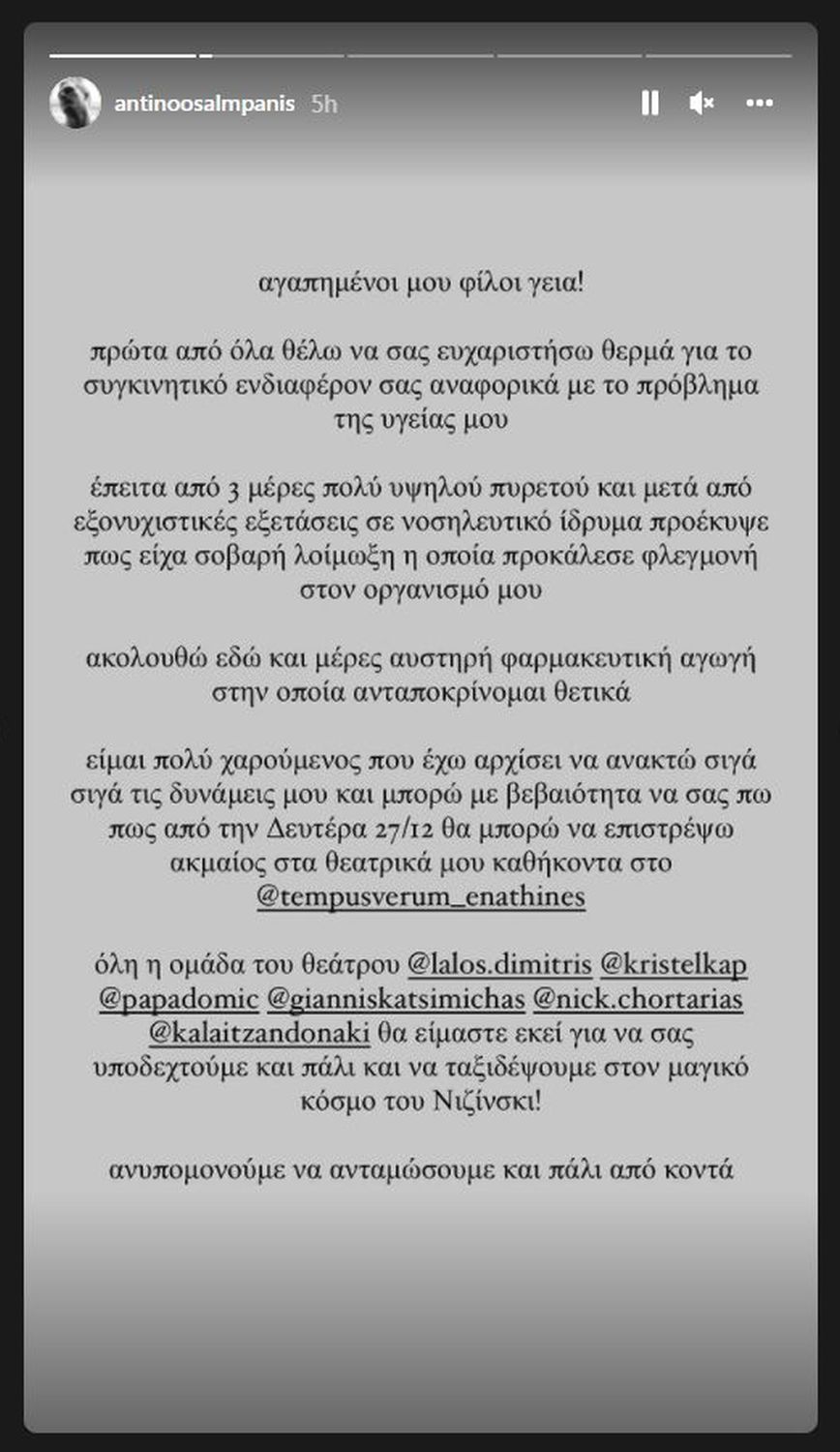 Ακολουθώ εδώ και μέρες αυστηρή φαρμακευτική αγωγή, στην οποία ανταποκρίνομαι θετικά. Είμαι πολύ χαρούμενος που έχω αρχίσει να ανακτώ σιγά-σιγά τις δυνάμεις μου και μπορώ με βεβαιότητα να σας πω πως από τη Δευτέρα 27/12 θα μπορώ να επιστρέψω ακμαίος στα θεατρικά μου καθήκοντα στο @tempusverum_enathines. Όλη η ομάδα του θέατρου @lalos.dimitris @kristelkap @papadomic @gianniskatsimichas @nick.chortarias @kalaitzandonaki θα είμαστε εκεί για να σας υποδεχτούμε και πάλι και να ταξιδέψουμε στον μαγικό κόσμο του Νιζίνσκι. Ανυπομονούμε να ανταμώσουμε και πάλι από κοντά».