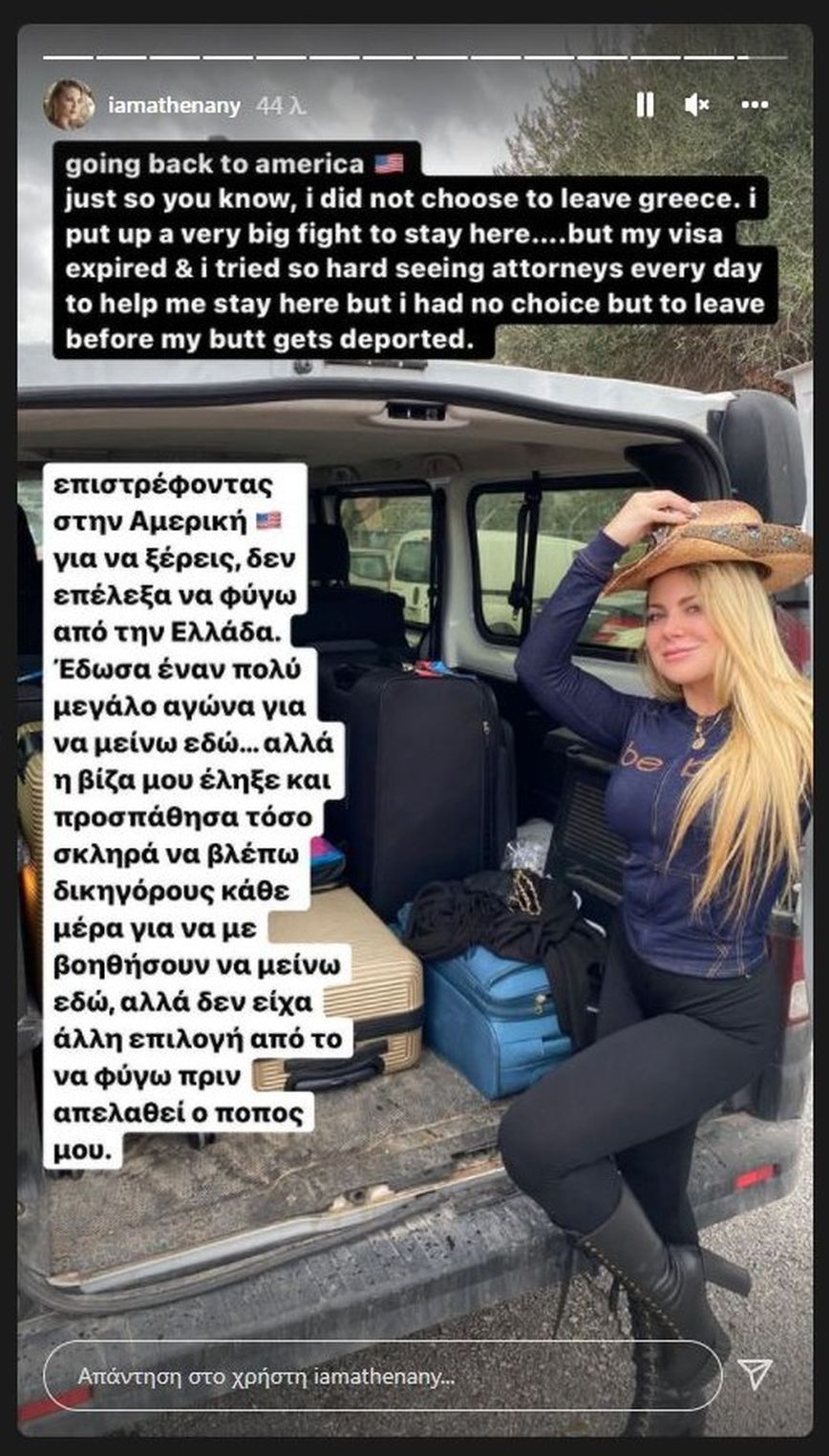 Από την πλευρά της, η Αθηνά, μέσω Instastory έκανε γνωστό πως ταξιδεύει για την Αμερική και ο λόγος είναι πως έληξε η βίζα της.