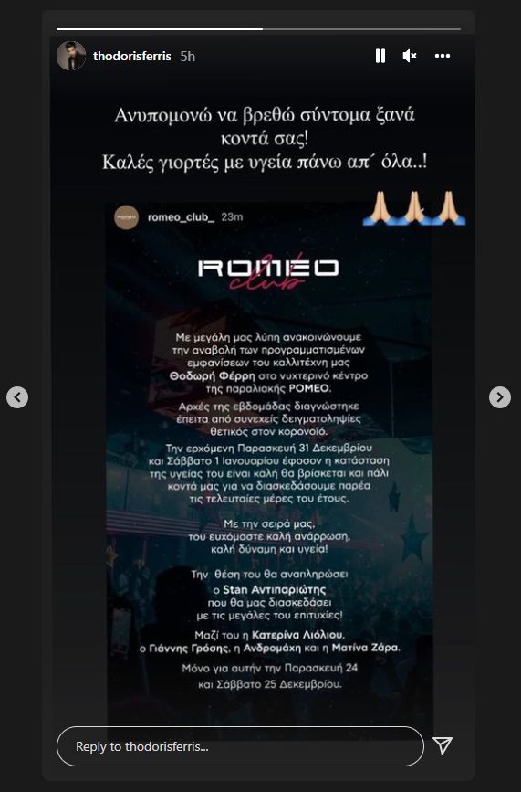 «Με μεγάλη μας λύπη ανακοινώνουμε την αναβολή των προγραμματισμένων εμφανίσεων του καλλιτέχνη μας Θοδωρή Φέρρη στο νυχτερινό κέντρο της παραλιακής. Αρχές της εβδομάδας διαγνώστηκε έπειτα από συνεχείς δειγματοληψίες, θετικός στον κορονοϊό» αναφέρεται στο Instastory που δημοσίευσε ο τραγουδιστής στον λογαριασμό του.