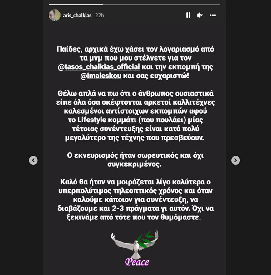 «Παίδες, αρχικά έχω χάσει τον λογαριασμό από τα μηνύματα που στέλνετε για τον Τάσο Χαλκιά και την εκπομπή της Ιωάννας Μαλέσκου και σας ευχαριστώ. Θέλω απλά να πω ότι ο άνθρωπος είπε ουσιαστικά όλα όσα σκέφτονται αρκετοί καλλιτέχνες, καλεσμένοι αντίστοιχων εκπομπών, αφού το life style κομμάτι που πουλάει, μιας τέτοιας συνέντευξης, είναι κατά πολύ μεγαλύτερο της τέχνης που πρεσβεύουν.