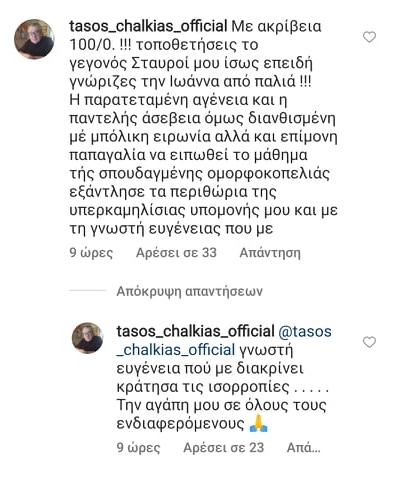 Ο Τάσος Χαλκιάς σχολίασε στην ανάρτηση του Σταύρου Νικολαΐδη, χαρακτηρίζοντας την Ιωάννα Μαλέσκου «σπουδαγμένη ομορφοκοπελιά» και κάνοντας λόγο για «παρατεταμένη αγένεια» και «παντελή ασέβεια».