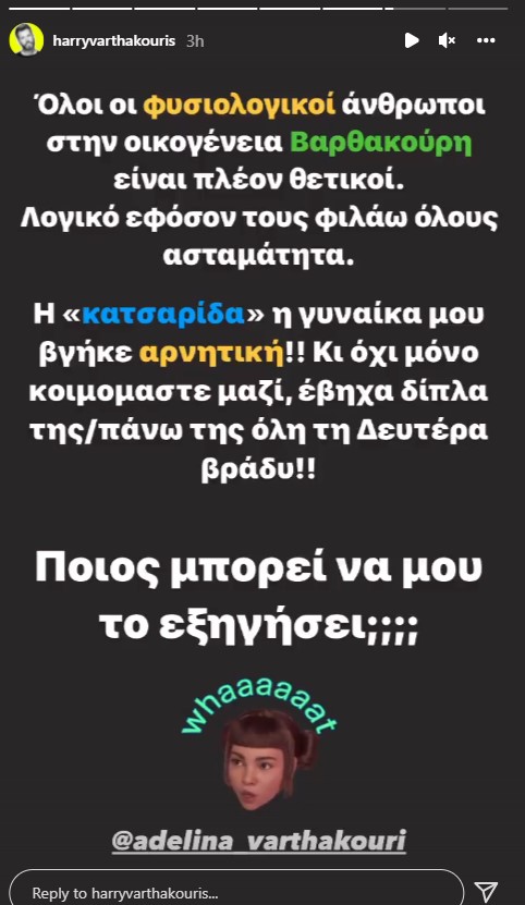 «Όλοι οι φυσιολογικοί άνθρωποι στην οικογένεια Βαρθακούρη είναι πλέον θετικοί. Λογικό εφόσον τους φιλάω όλους ασταμάτητα. Η “κατσαρίδα” η γυναίκα μου βγήκε αρνητική!! Κι όχι μόνο κοιμόμαστε μαζί, έβηχα δίπλα της/πάνω της όλη τη Δευτέρα βράδυ!! Ποιος μπορεί να μου το εξηγήσει;;;», έγραψε.