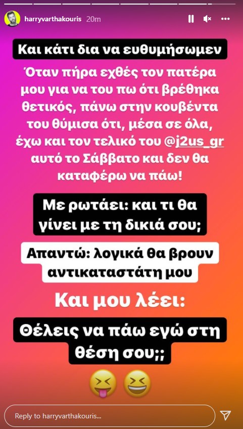 Σε επόμενο story του, ο Χάρης Βαρθακούρης, αποκάλυψε την κουβέντα που είχε με τον πατέρα του, Γιάννη Πάριο, ο οποίος του πρότεινε να τον αντικαταστήσει στο J2US.