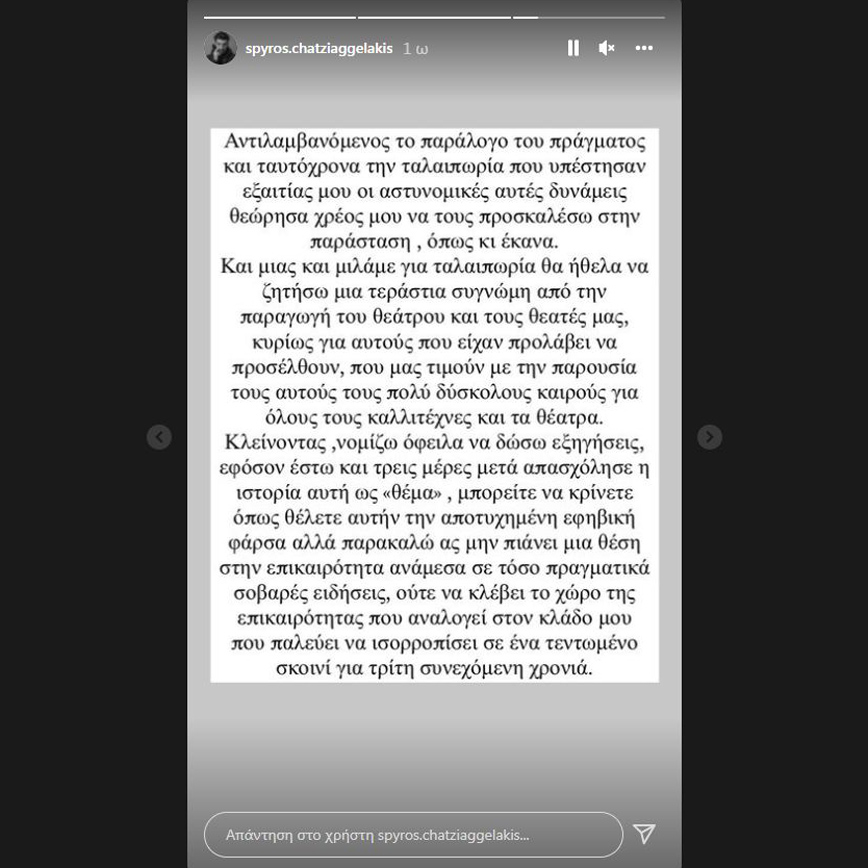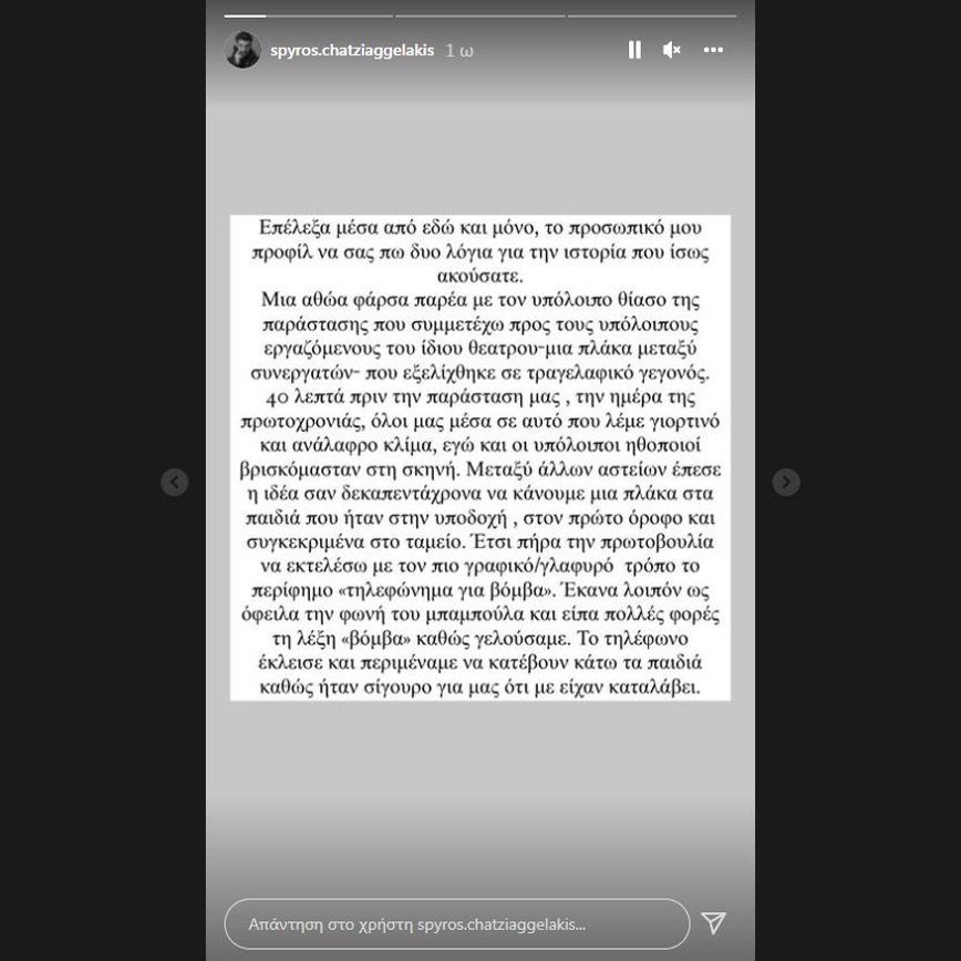 «Επέλεξα μέσα από εδώ και μόνο, το προσωπικό μου προφίλ να σας πω δύο λόγια για την ιστορία που ακούσατε. Μια αθώας φάρσα παρέα με τον υπόλοιπο θίασο της παράστασης που συμμετέχω προς τους υπόλοιπους εργαζόμενους του ίδιου θεάτρου, μια πλάκα μεταξύ συνεργατών, που εξελίχθηκε σε τραγελαφικό γεγονός» έγραψε αρχικά ο Σπύρος Χατζηαγγελάκης.
