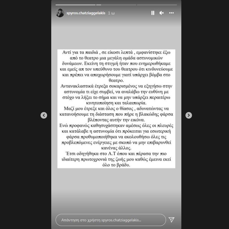 «Αντί για τα παιδιά, σε είκοσι λεπτά, εμφανίστηκε έξω από το θέατρο μια μεγάλη ομάδα αστυνομικών δυνάμεων. Εκείνη την στιγμή ήταν που ενημερωθήκαμε και εμείς από τον υπεύθυνο του θεάτρου ότι κινδυνεύουμε και πρέπει να αποχωρήσουμε γιατί υπάρχει βόμβα στο θέατρο. Αντανακλαστικά έτρεξα σοκαρισμένος να εξηγήσω στην αστυνομία τι είχε συμβεί, να αναλάβω την ευθύνη με στόχο να λήξει το σήμα και να μην υπάρξει περαιτέρω κινητοποίηση και ταλαιπωρία.