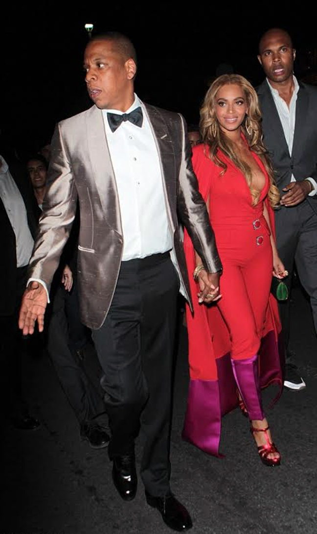 H εκρηκτική ποπ σταρ κάθισε στην πρώτη σειρά των καθισμάτων φορώντας μία αποκαλυπτική κόκκινη ολόσωμη φόρμα, με ένα πολύ βαθύ ντεκολτέ, που άφηνε σχεδόν ακάλυπτο το στήθος της. Δίπλα της ο σύζυγός της Jay Z με ασημί γυαλιστερό σακάκι, μαύρο παντελόνι και παπιγιόν.