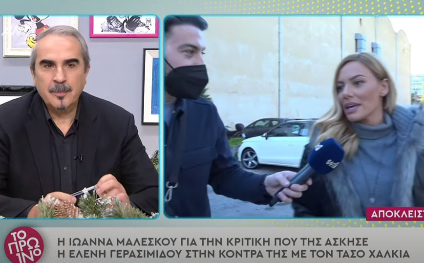 Ο Τάσος Χαλκιάς και η «επεισοδιακή» επίσκεψη του στο πλατό της εκπομπής «Love It» την περασμένη εβδομάδα συνεχίζει να συζητιέται στα πάνελ των πρωινών εκπομπών. Η Ελένη Γερασιμίδου, ήταν ένα από τα πρόσωπα που είχε πάρει θέση για το συγκεκριμένο θέμα και είχε πετάξει τα βέλη της κατά της παρουσιάστριας του ΣΚΑΪ, Ιωάννας Μαλέσκου τονίζοντας πως: «Έρχεται η “κούκλα” να σε κατακεραυνώσει με τον μικροαστικό σουσουδισμό της».